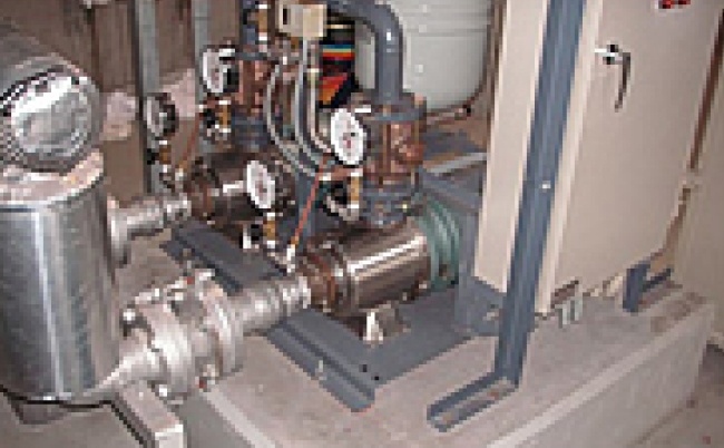 熱源機器で作られる冷水・温水を空調機やファンコイルへ循環させるためのポンプです。